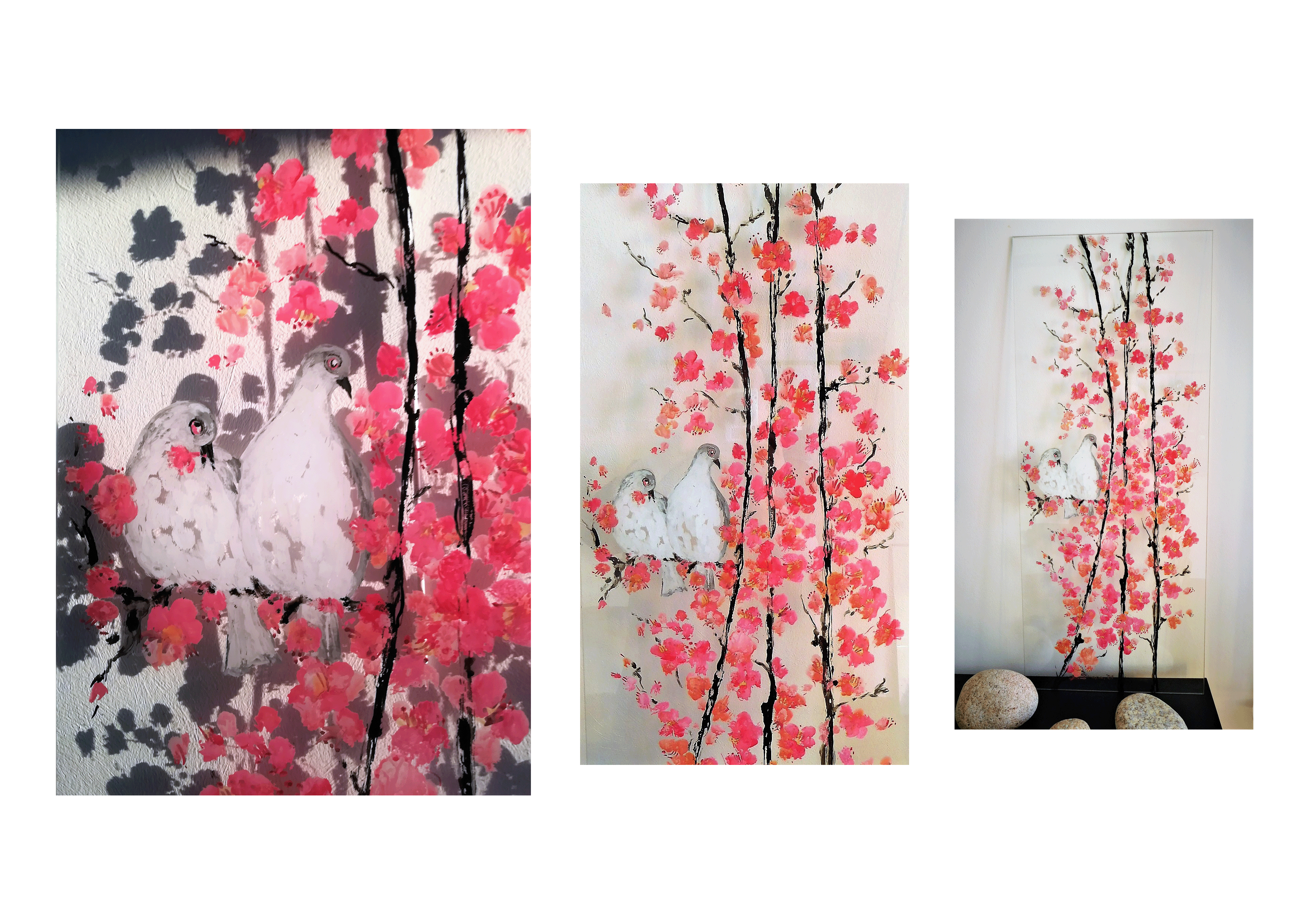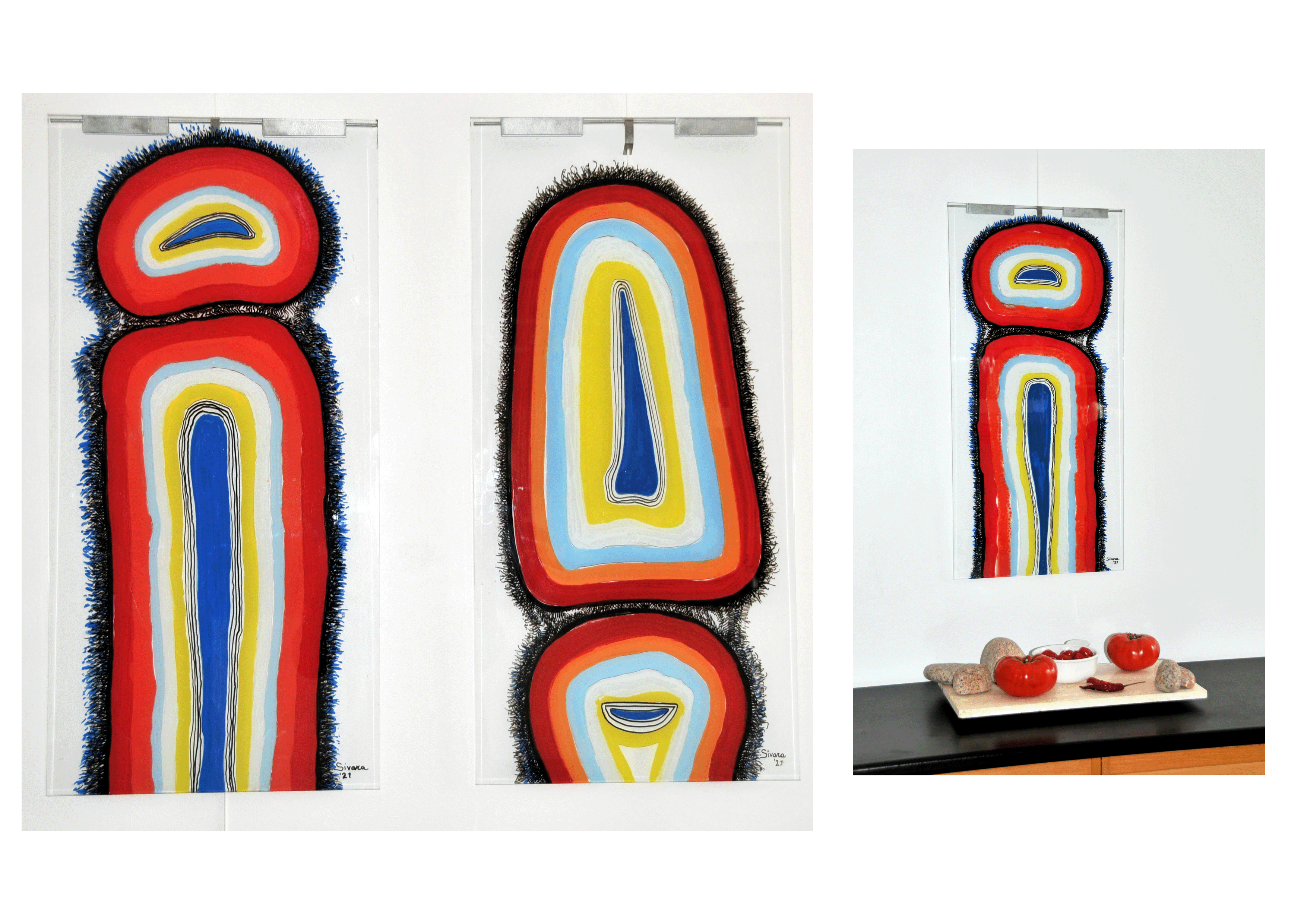 The deep interest in material, colour and form led me to develop various forms of expression, such as watercolour, oil painting, pen drawing, collage, calligraphy, glass art, glass casting and glass blowing, and églomisé, which is an ancient technique of painting on the back of a glass surface.