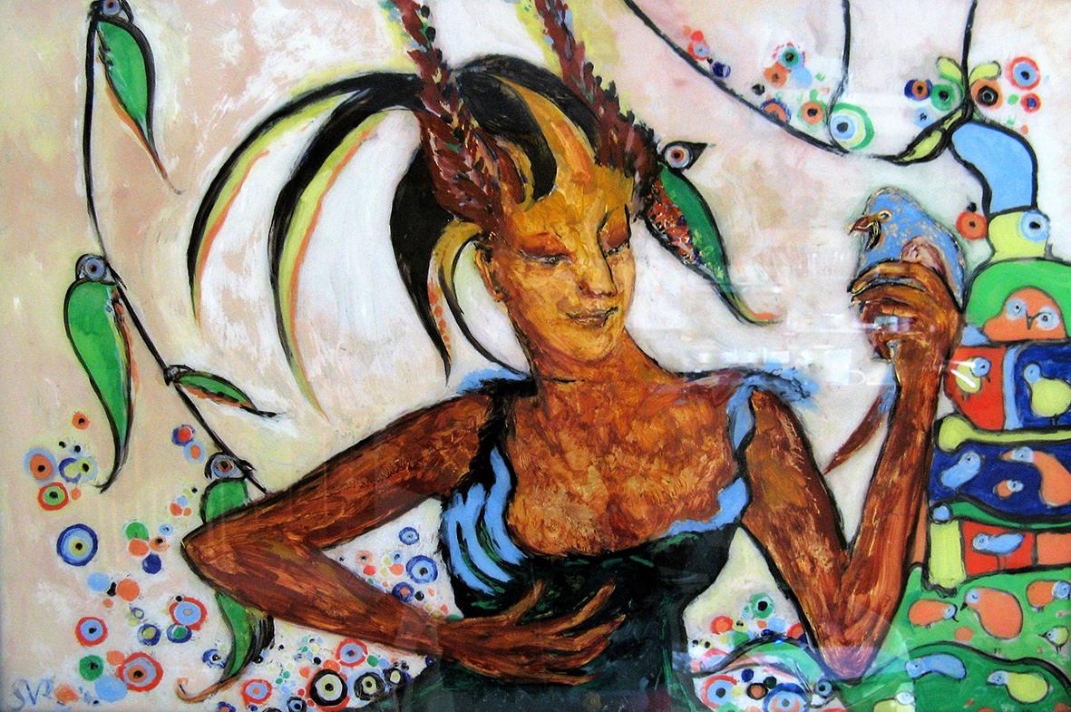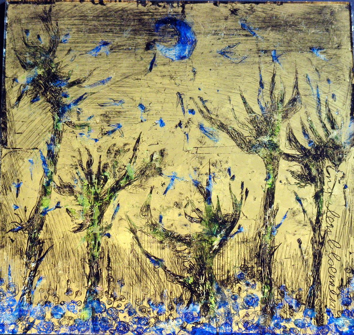 The back glass painter works in reverse order. The details come first and then various layers of paint, translucent or not, with different media. These layers can be etched, especially when gold leaf or silver leaf is used.