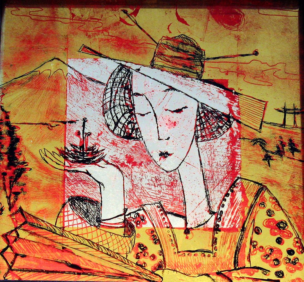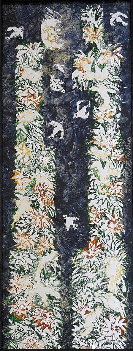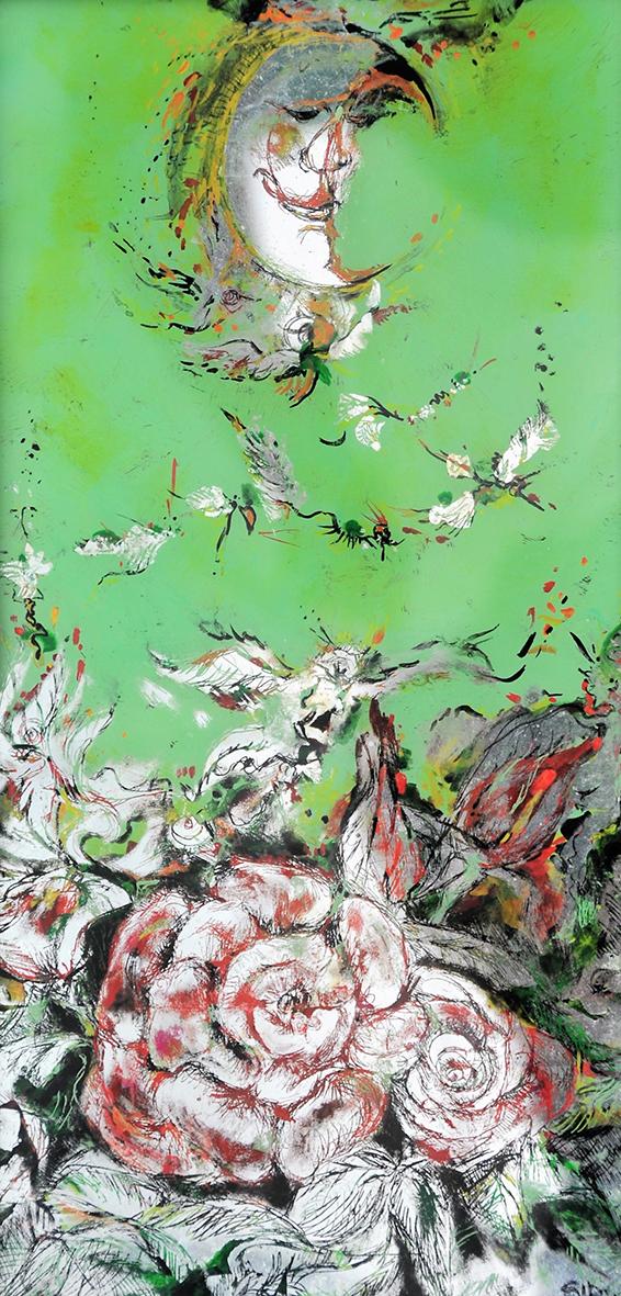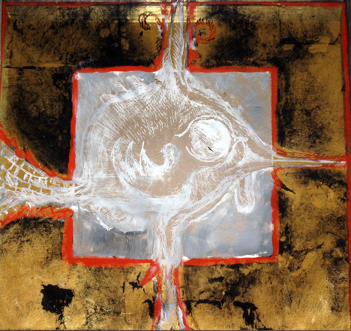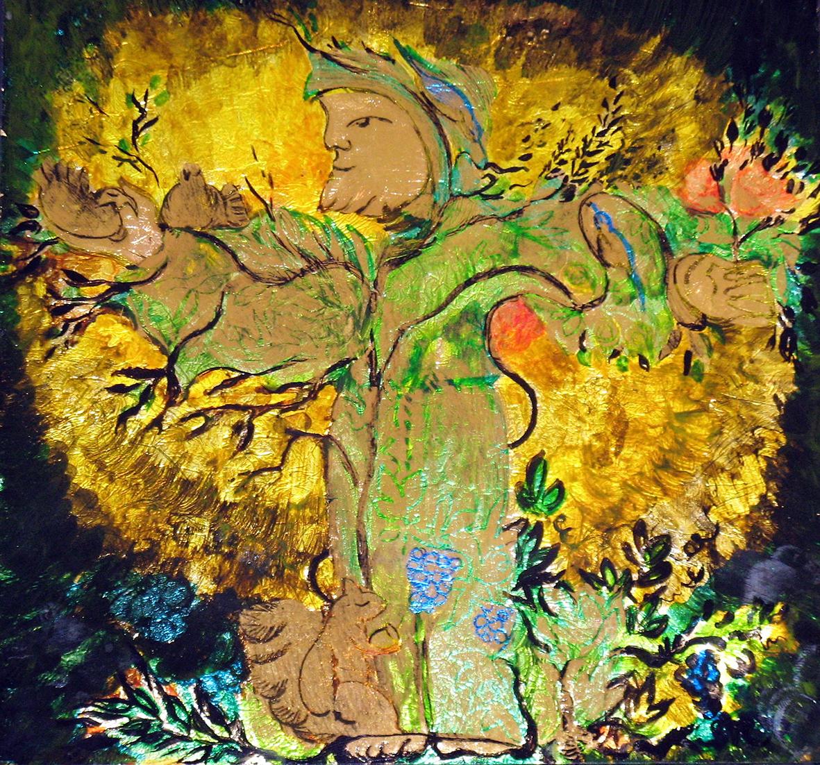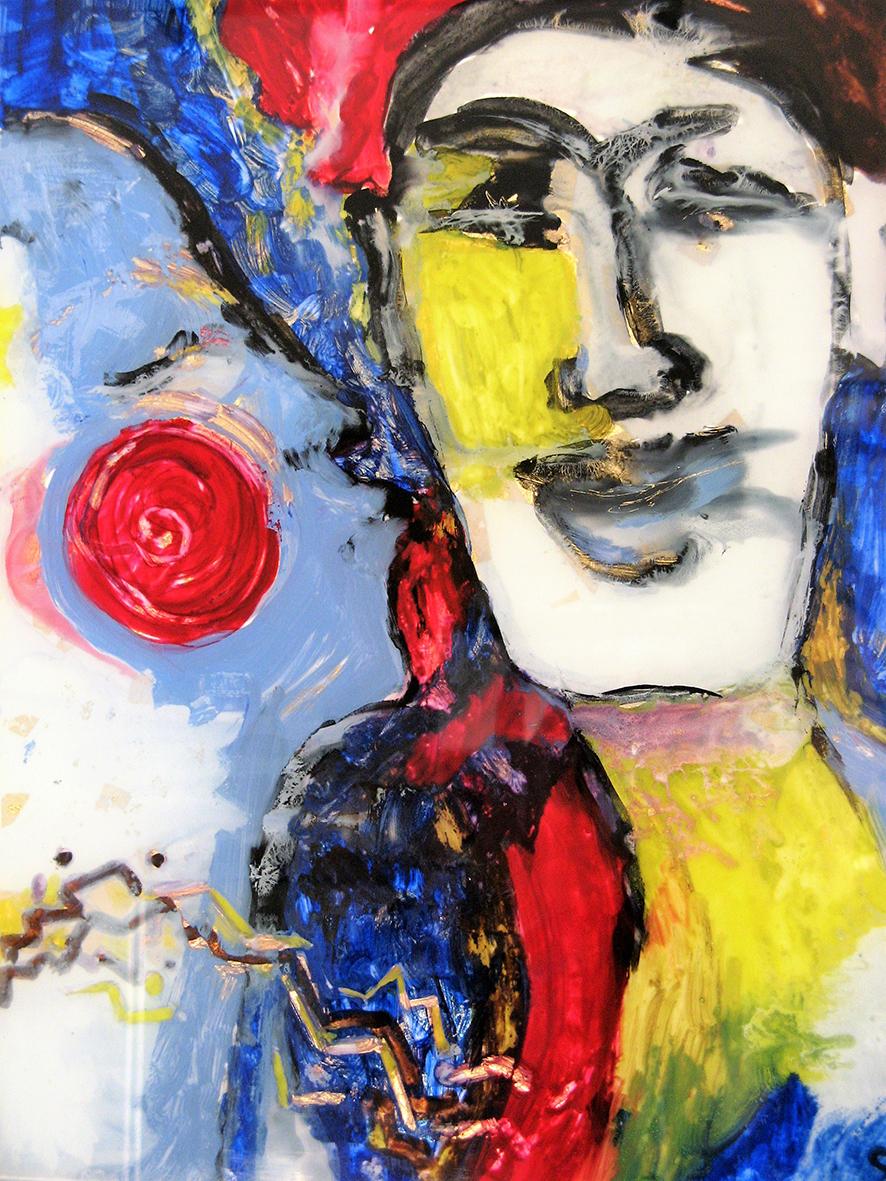 The back glass painter works in reverse order. The details come first and then various layers of paint, translucent or not, with different media. These layers can be etched, especially when gold leaf or silver leaf is used.