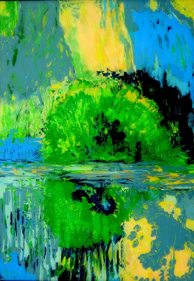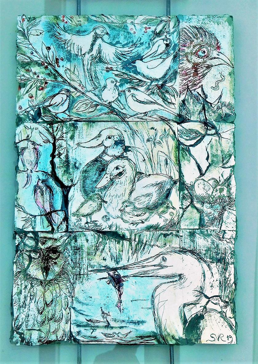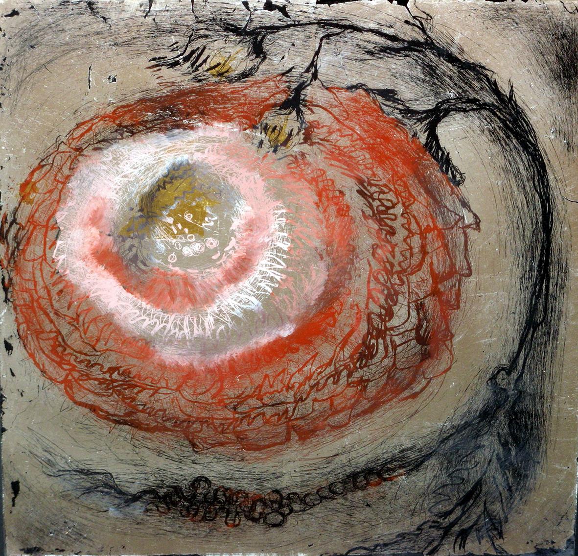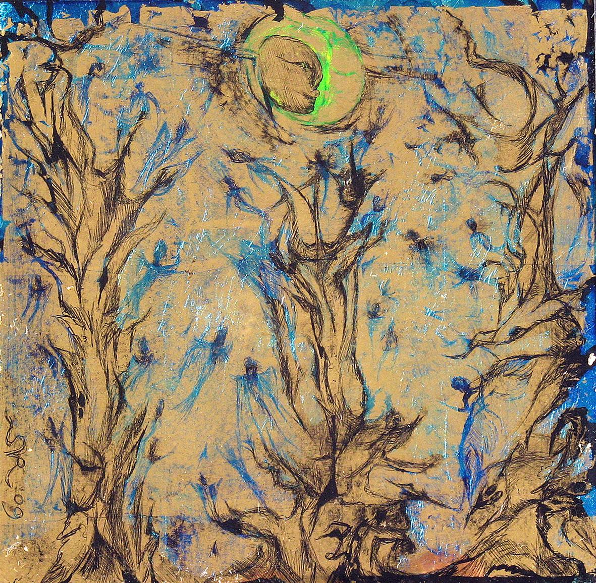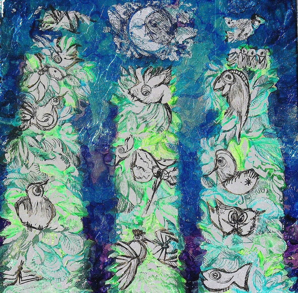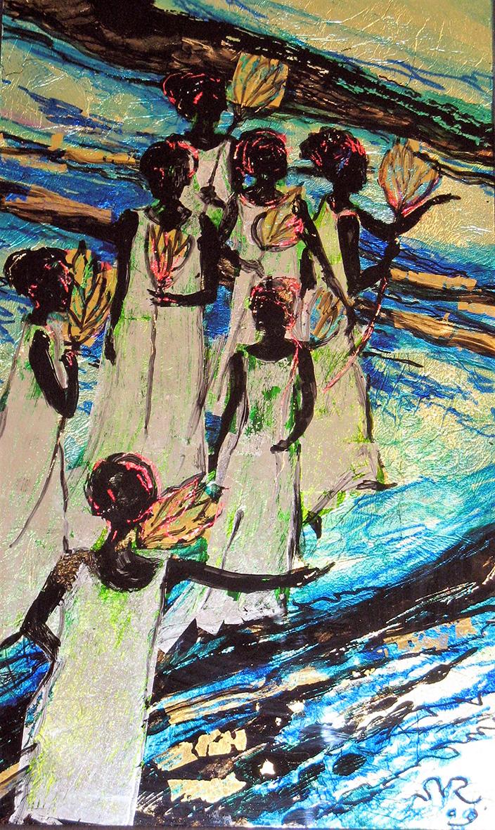 The back glass painter works in reverse order. The details come first and then various layers of paint, translucent or not, with different media. These layers can be etched, especially when gold leaf or silver leaf is used.