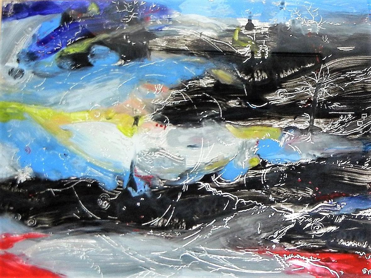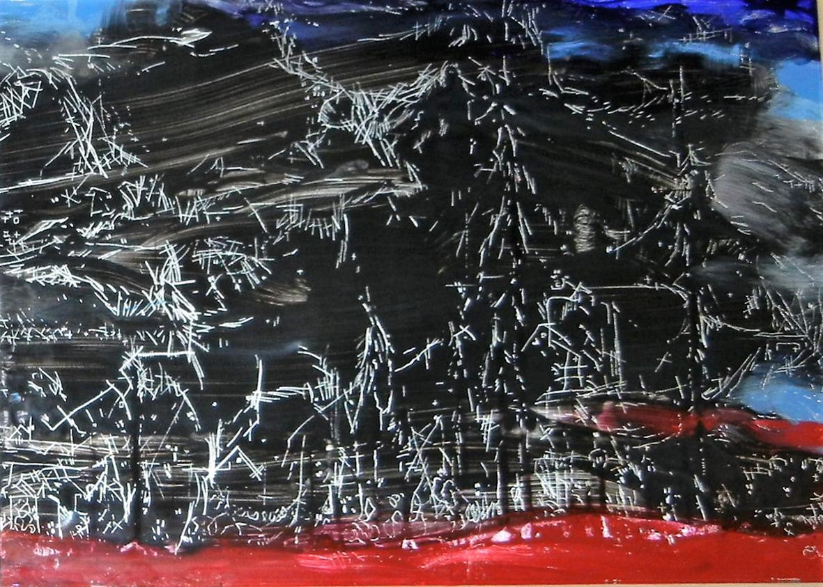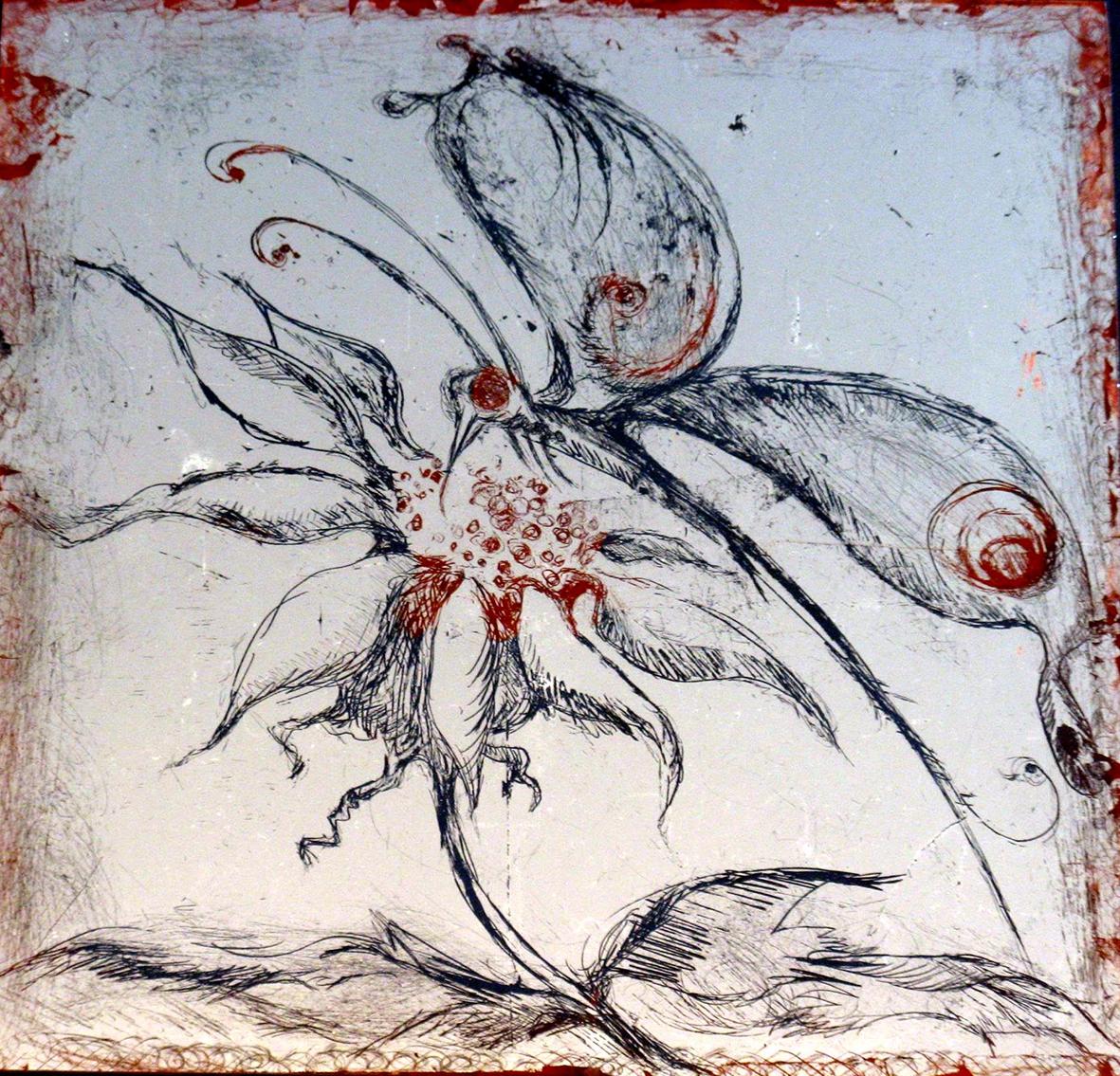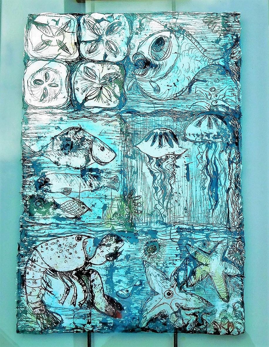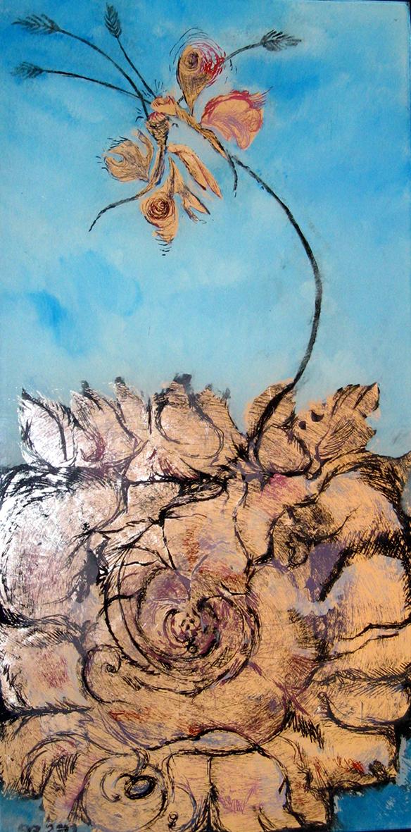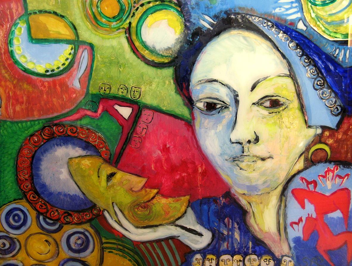 The back glass painter works in reverse order. The details come first and then various layers of paint, translucent or not, with different media. These layers can be etched, especially when gold leaf or silver leaf is used.