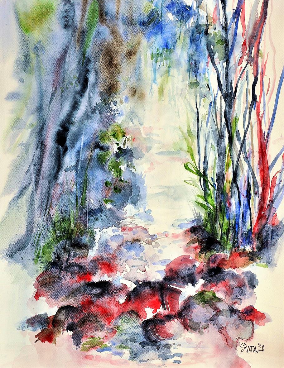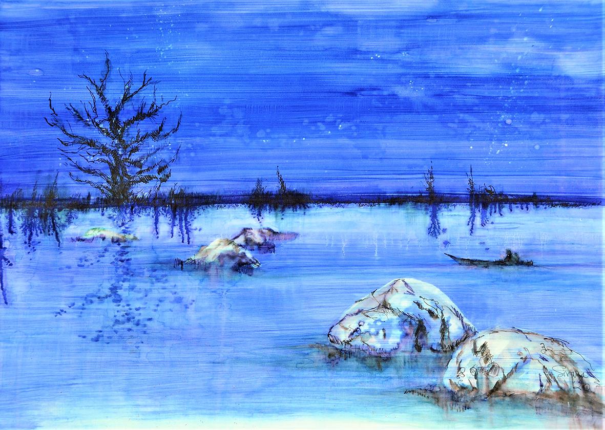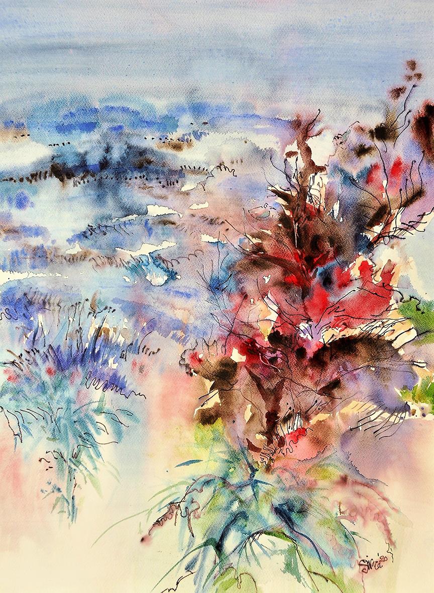 For these works, I use different techniques and materials: ink with watercolour, but also pencil, acrylic paint and pastels are used in combination.